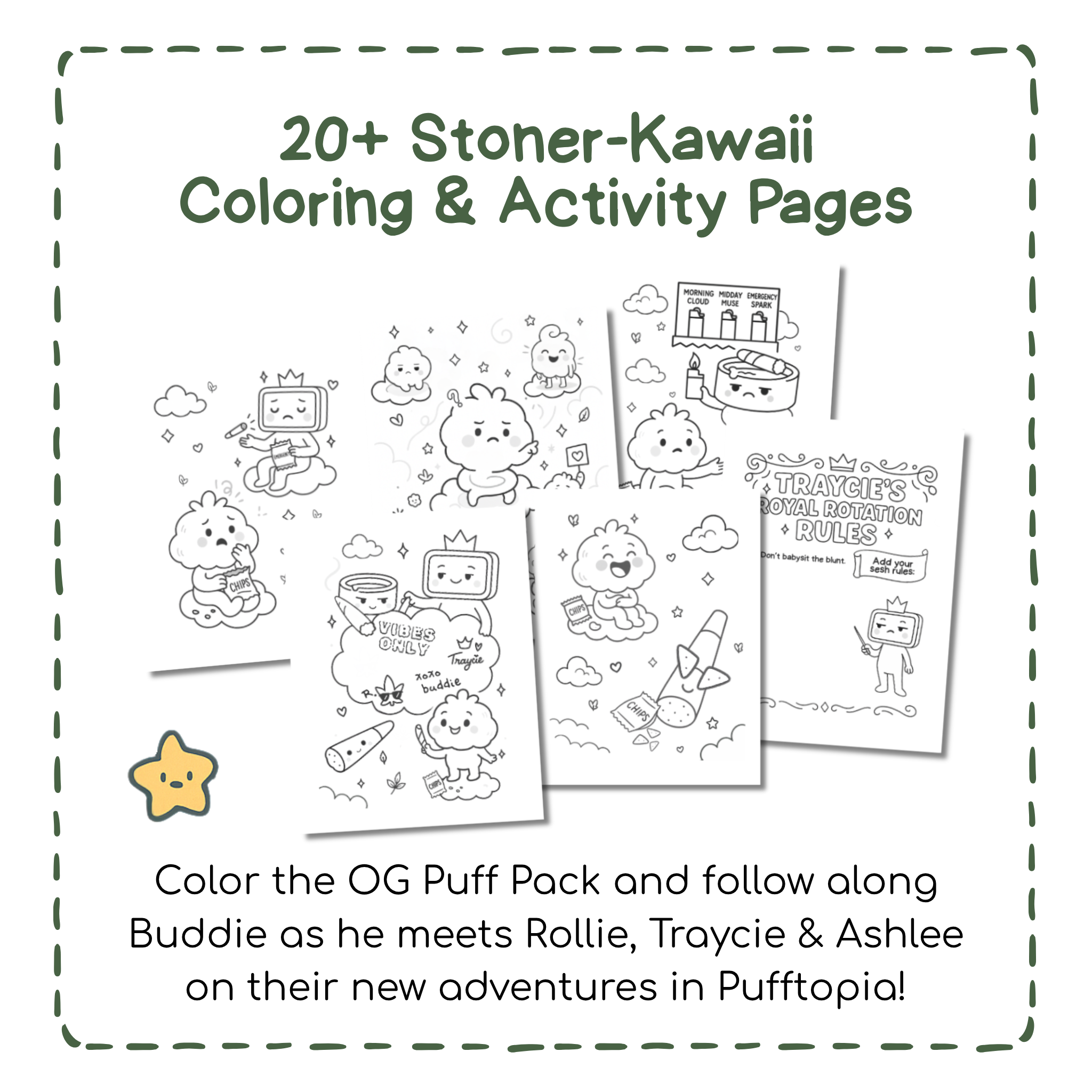 Meet Buddie and the OG Puff Pack, your new favorite sesh mates in the clouds. Blooming of Buddie coloring book takes you on a mellow ride through friendship, self-discovery, and ridiculously cute stoner lore.